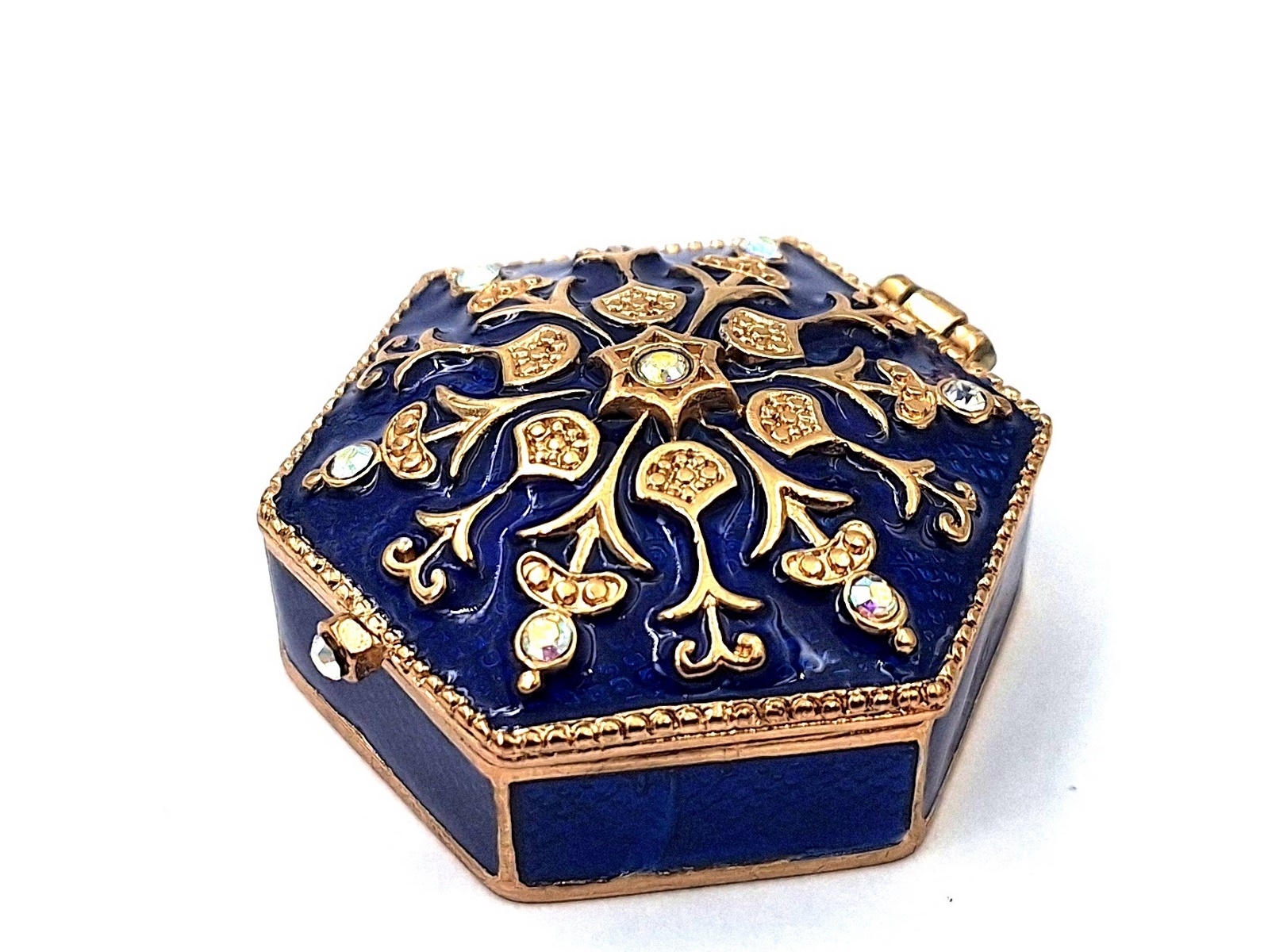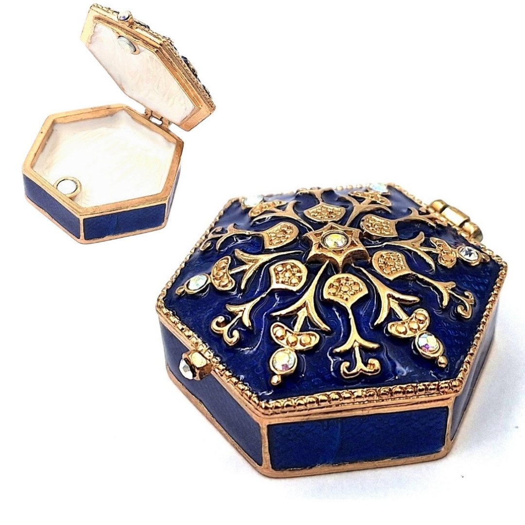 Szkatułka B0035-08BL to idealny pomysł na niepowtarzalny prezent dla kobiety! To nie tylko praktyczne pudełko na biżuterię, ale również piękny element dekoracyjny. Szkatułka jest bogato zdobiona kryształkami, co nadaje jej wyjątkowego charakteru. Pomimo niewielkich rozmiarów (5x5x2cm) może stanowić ozdobę sypialni, toaletki lub komody.